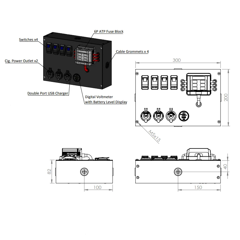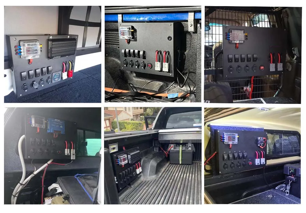| 1.Busbar 2.USB charger Socket 3.Rocker Switch 4.Voltage display meter 5.Power Outlet Socket 6.Fuse Block 7.Anderson-Connector 8.Circuit breaker 9.Membrane switch(6 way or 10 way) 10.Battery Switch 11.DC TO DC Charger 12.Solar charger Controller | |